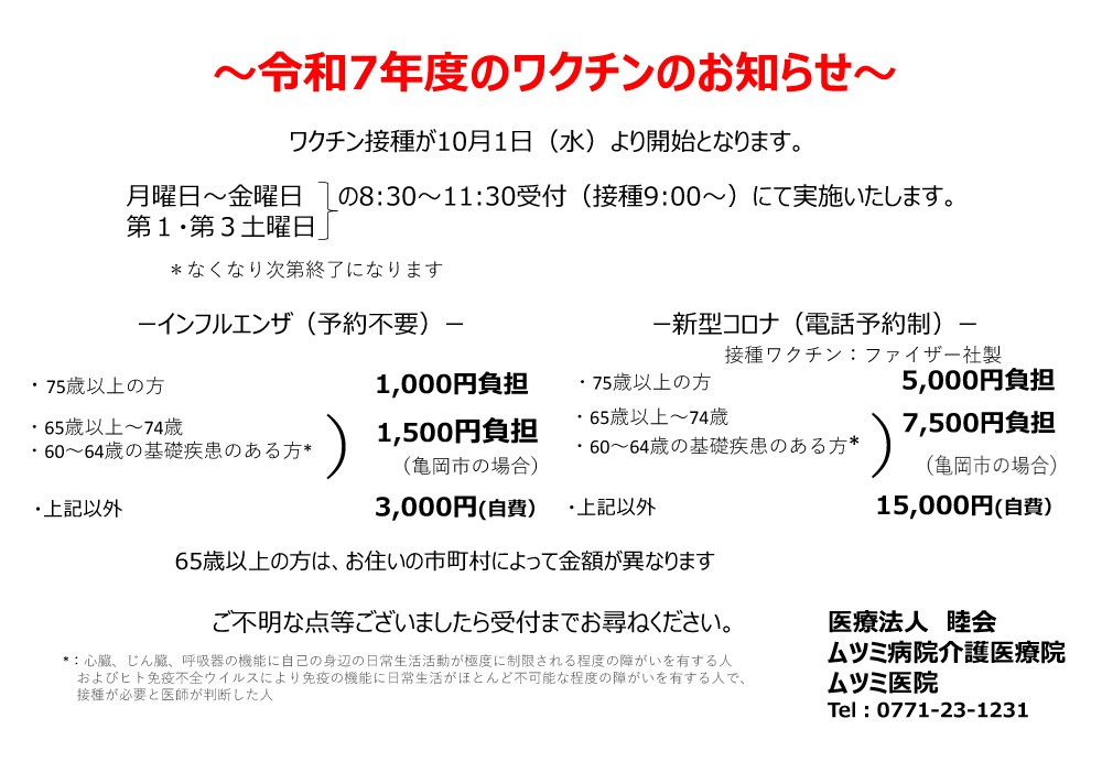 2025年9月30日 「令和7年度のワクチンのお知らせ」を掲載しました。